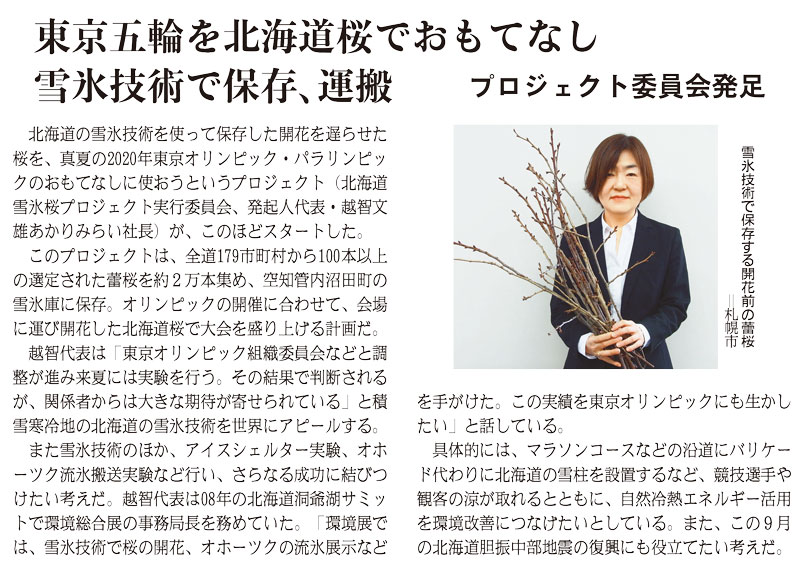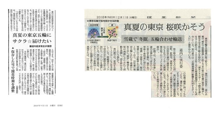 2020年東京五輪・パラリンピックの会場で、北海道の桜を開花させる計画が進んでいる。20年春、道内全市町村からつぼみが付いた桜の枝を集め、雪で室温2度前後にした倉庫「雪蔵」に保管。開花を遅らせて東京へ輸送し、夏の五輪会場で咲かせる流れだ。自治体などでつくる実行委員会は「2018年9月の北海道地震からの復興もアピールしたい」と意気込む。