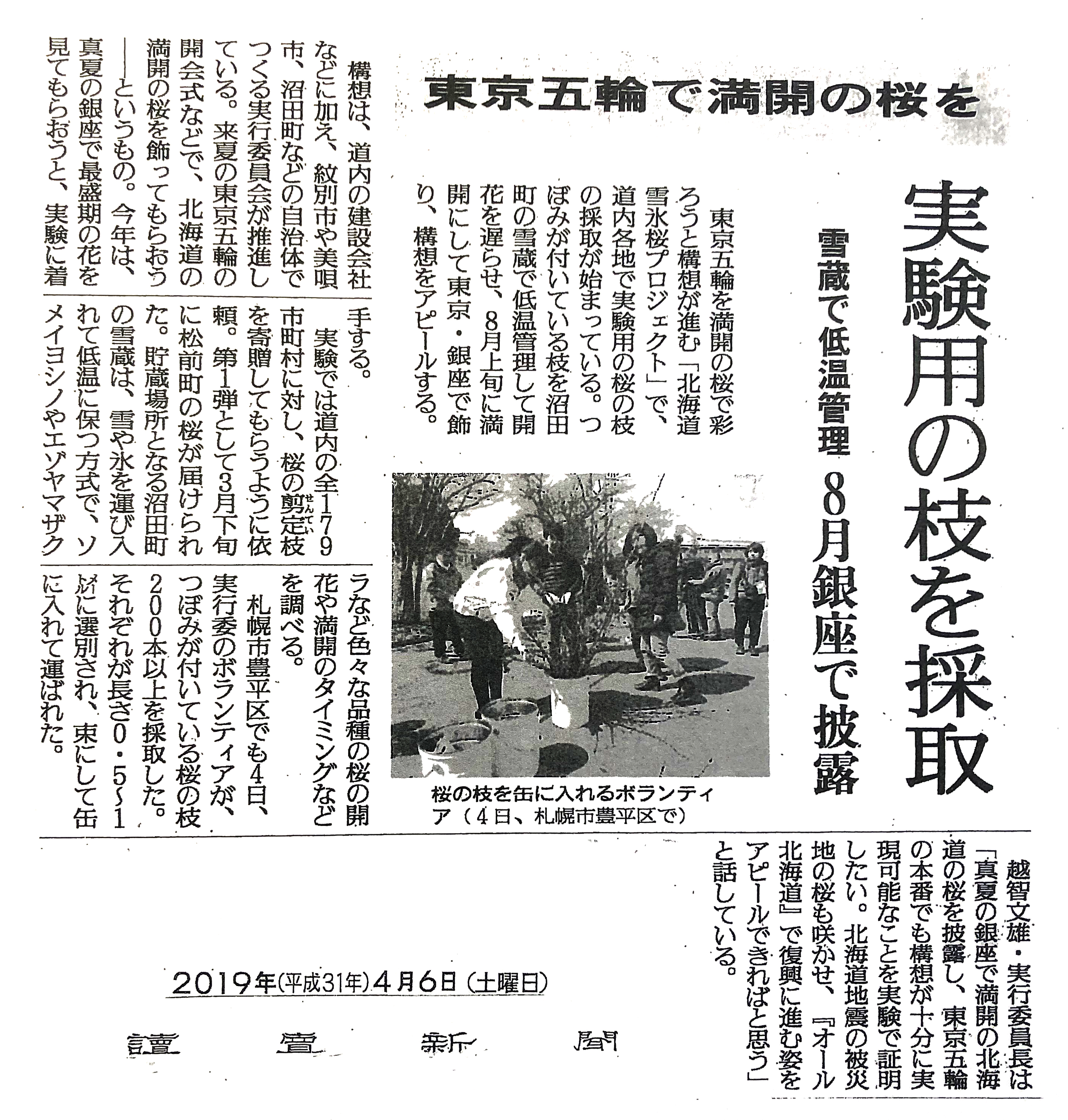 計画では、道内の全179市町村からエゾヤマザクラやソメイヨシノなどの枝を提供してもらう。環境に配慮し、枝切りで捨てられるものを計1万本以上集める。その後、沼田町にある雪蔵で保管。桜の枝は低温で保管すると活動停止の状態となるため、五輪直前に会場へ運んで開花させる。