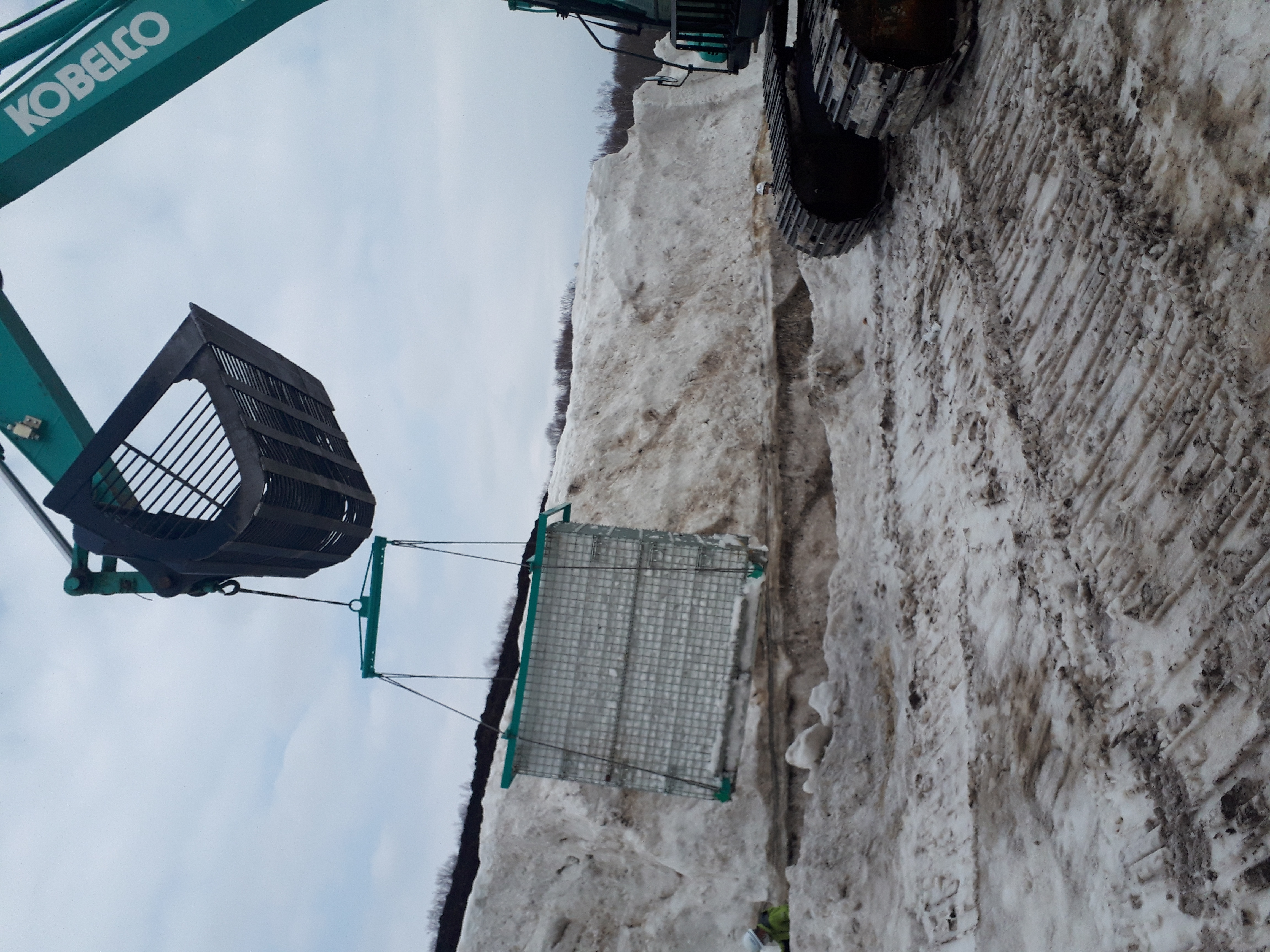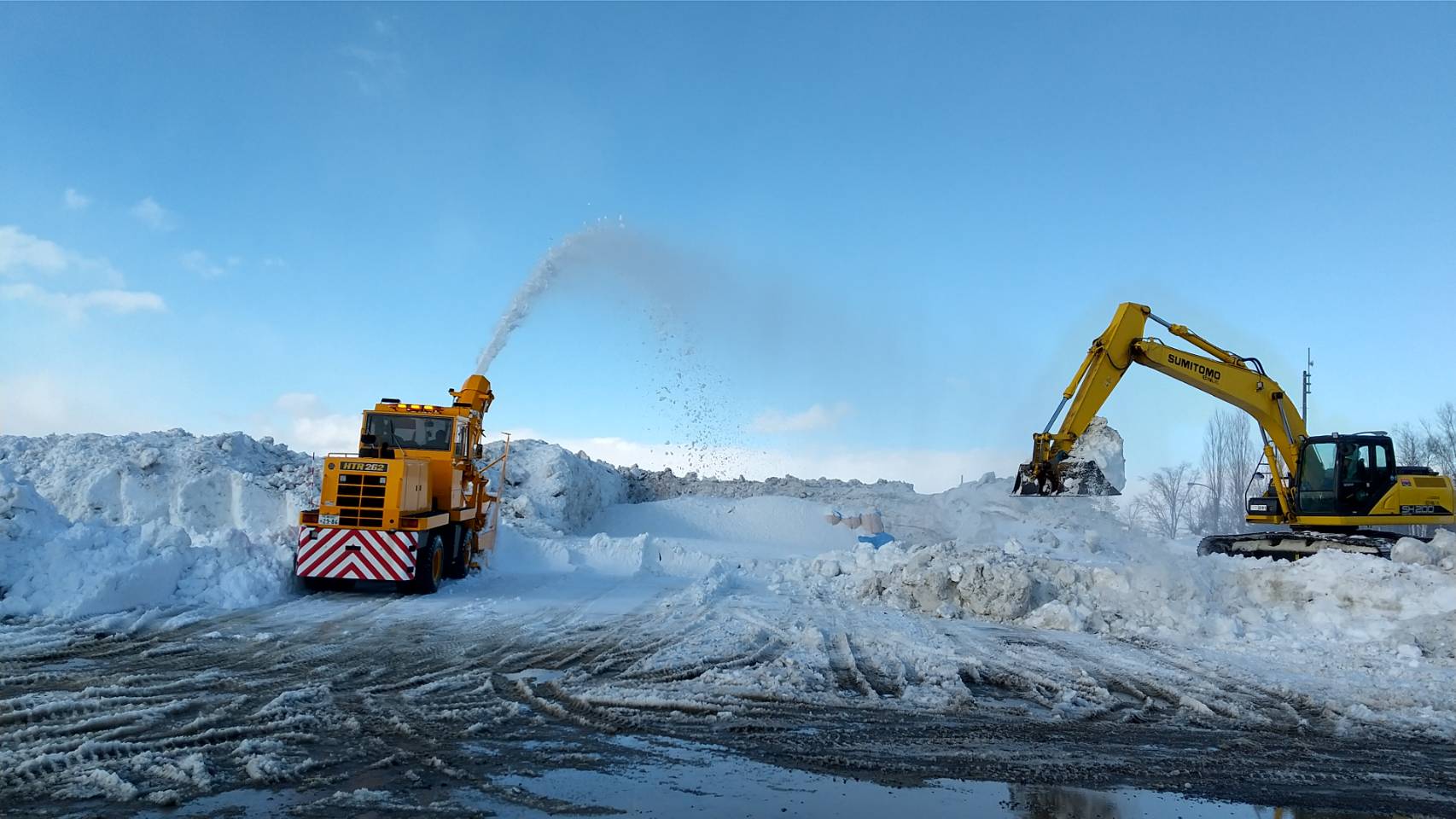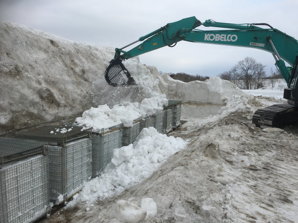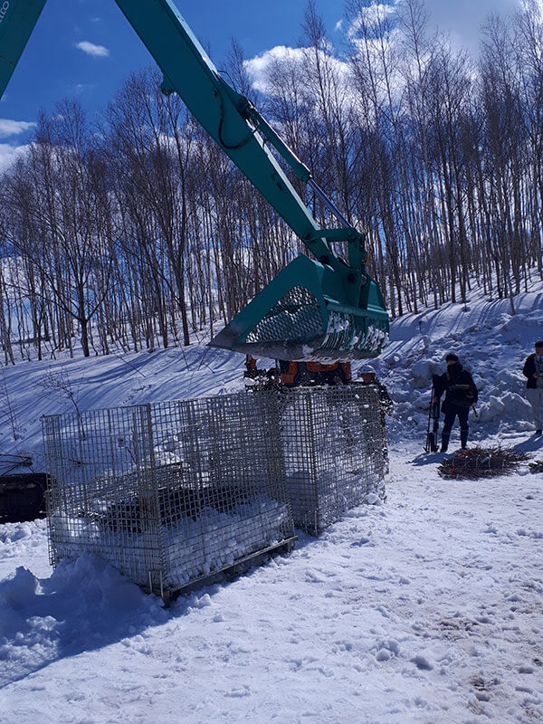 5.かごがいっぱいになったらショベルカーで、雪山まで移動します。