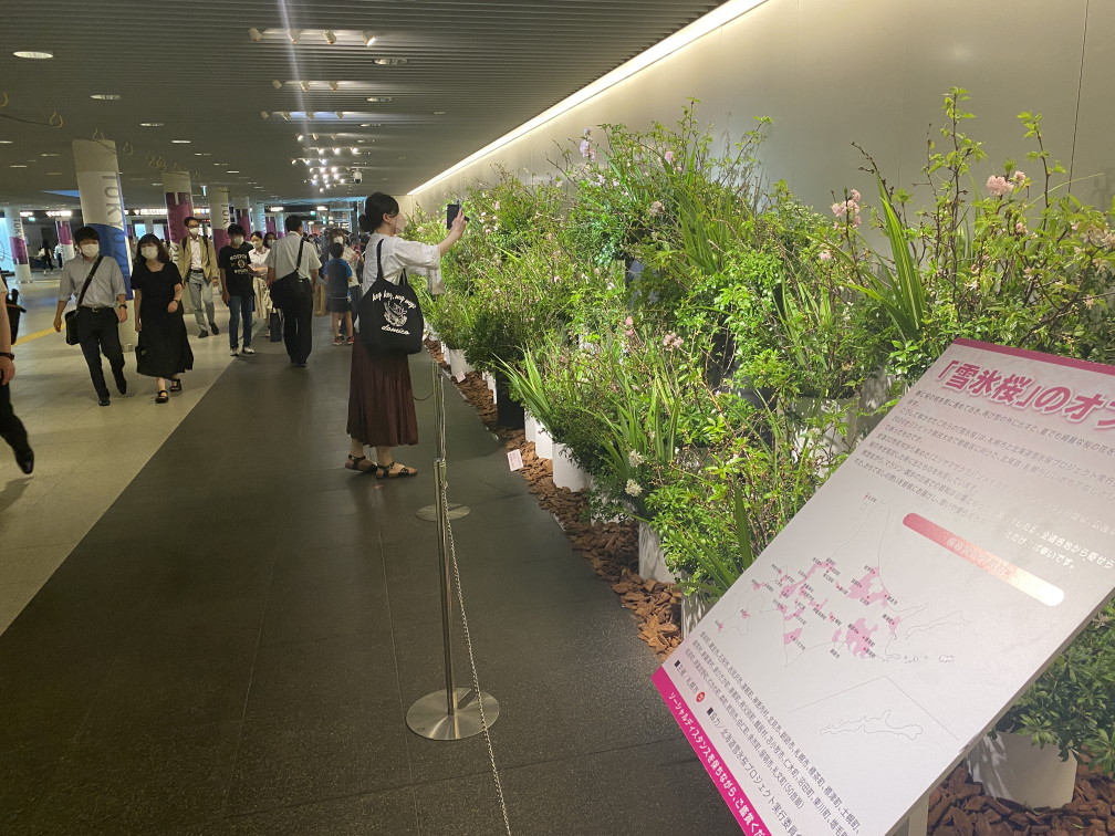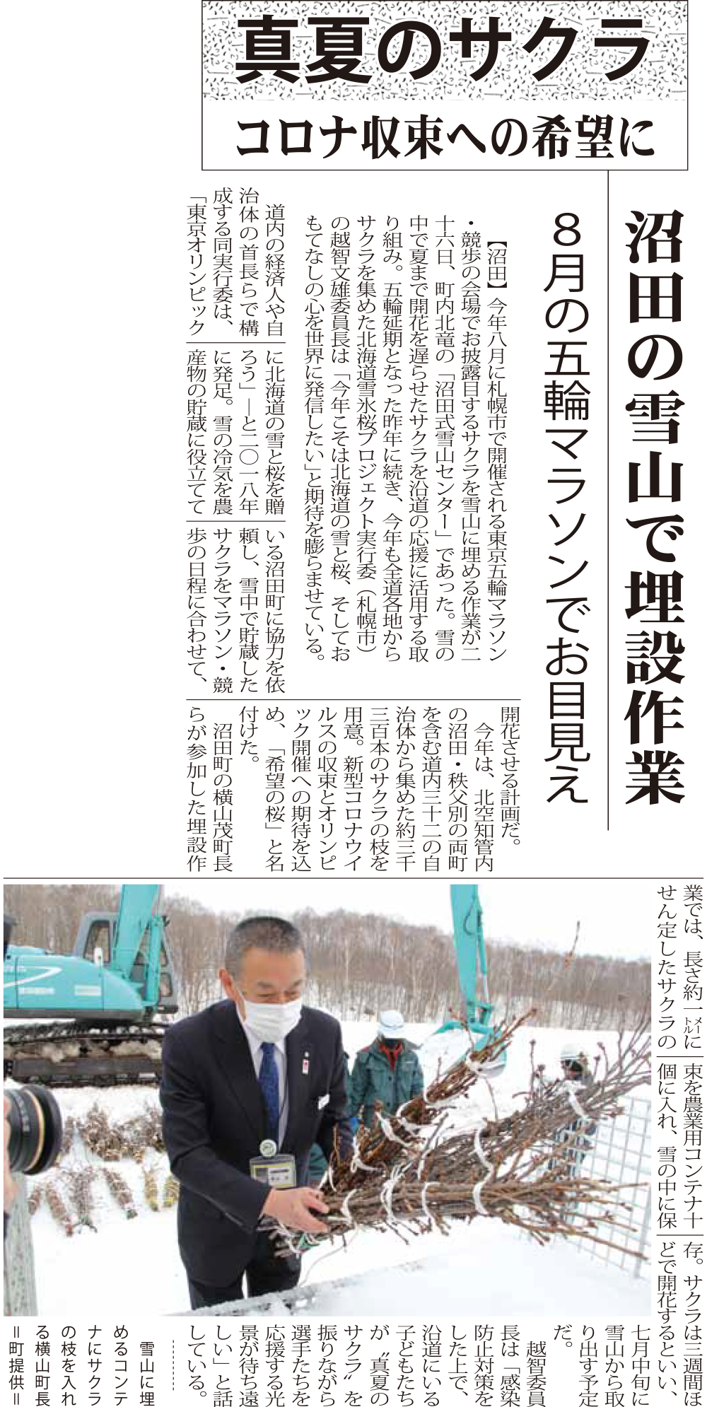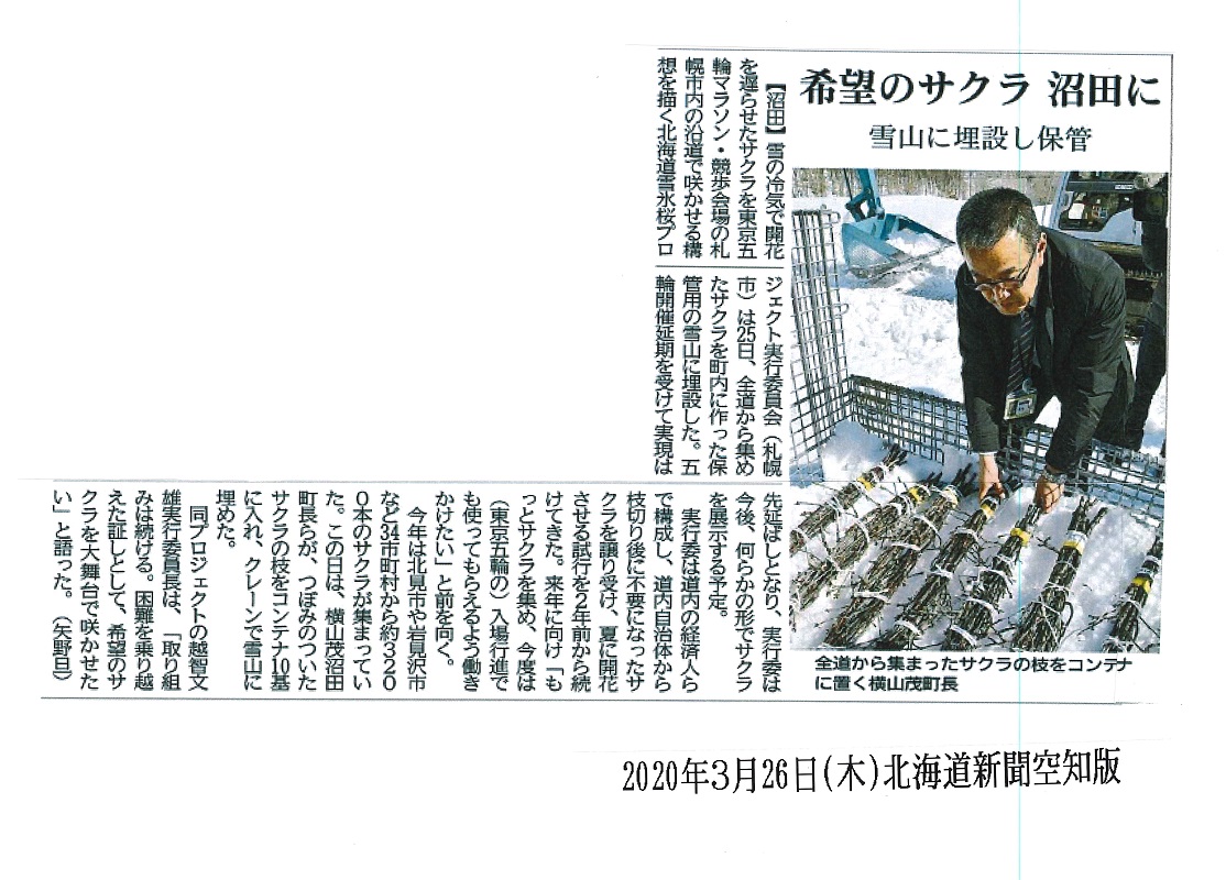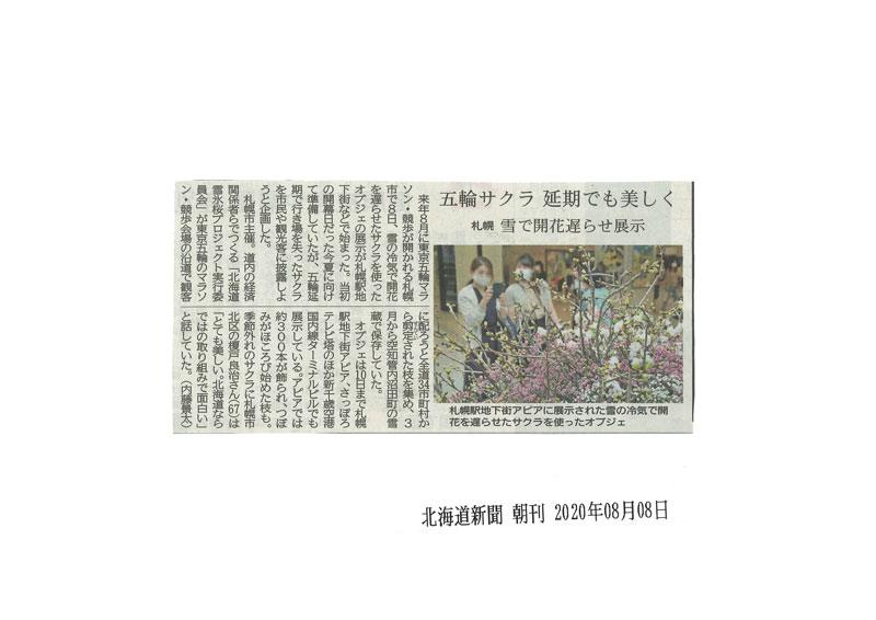 2020年冬、新型コロナウィルスの流行が始まった頃には、全道から30以上の自治体が参加し沼田町の大きな雪山の中に3千本の桜の蕾の枝が埋められました。ちょうどこの埋設の日にオリンピックの1年延期が決まり、昨年2020年の夏には千歳空港や札幌市駅周辺などで見事に開花した雪氷桜が披露されました。