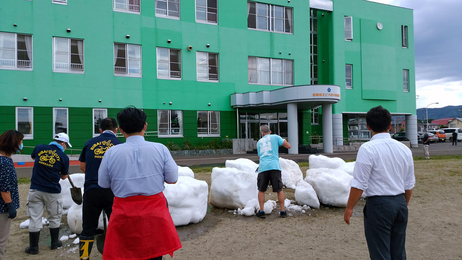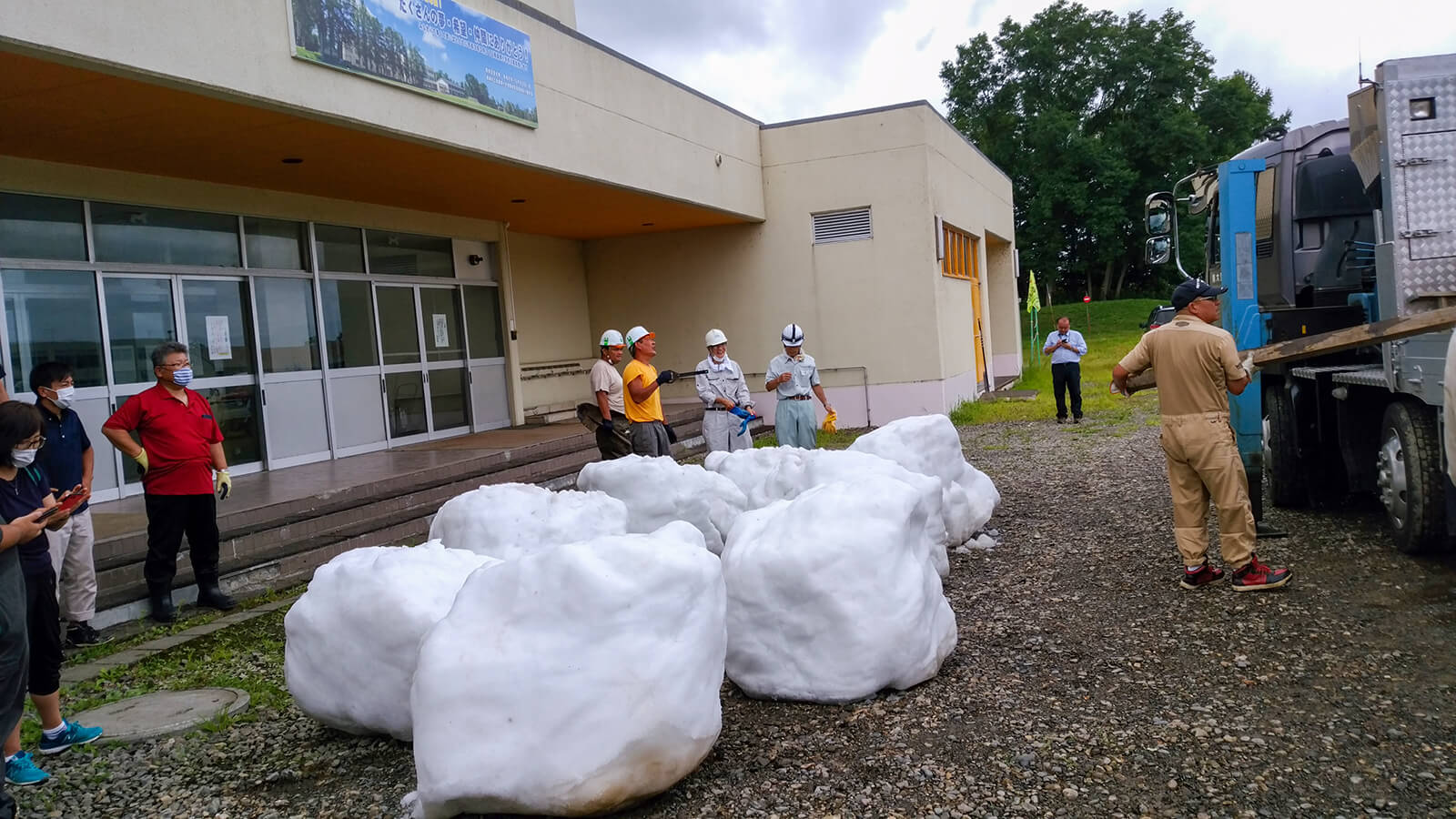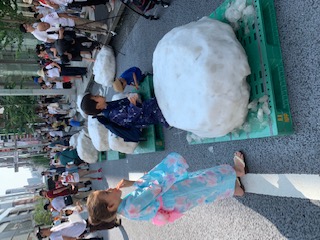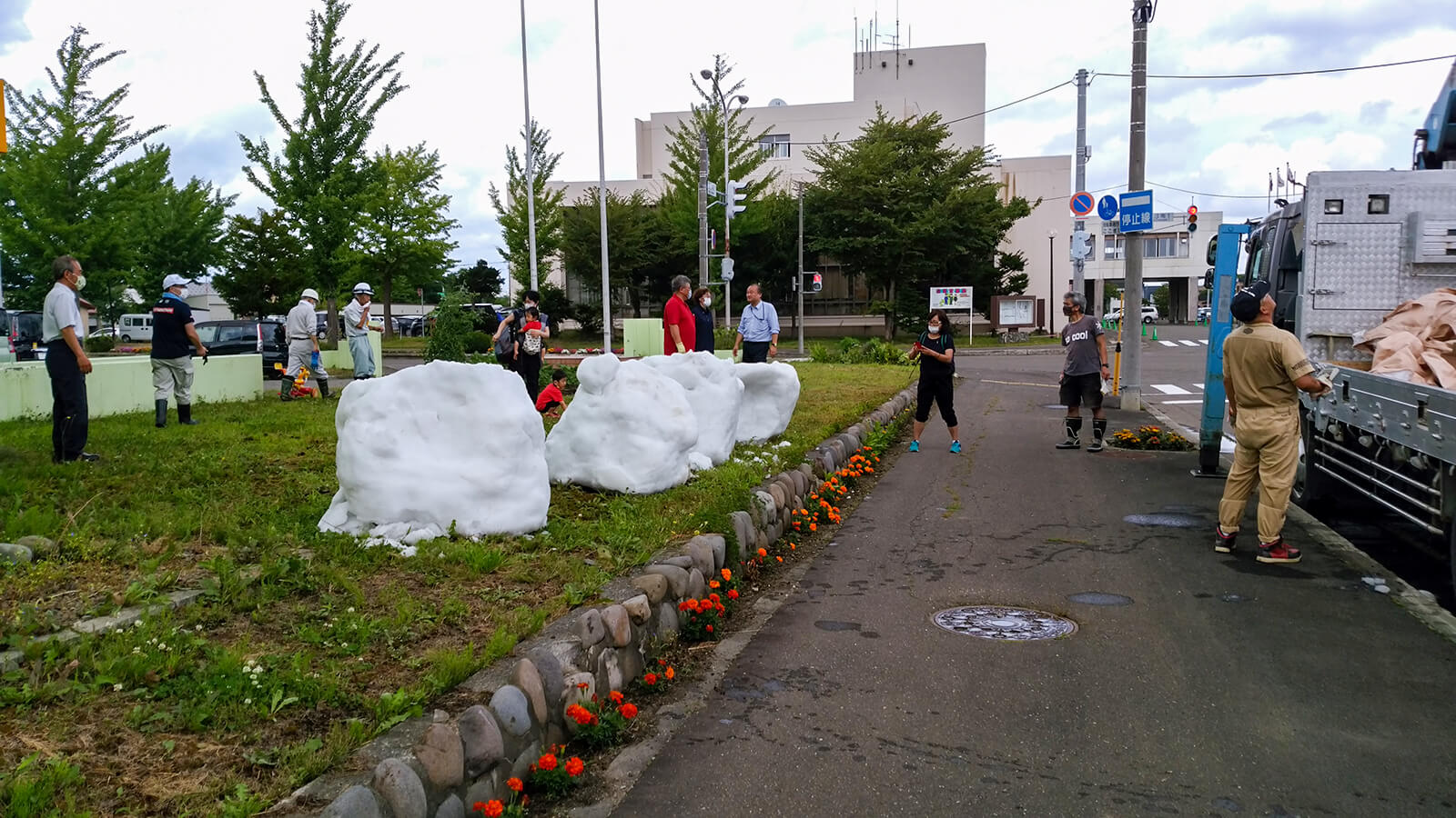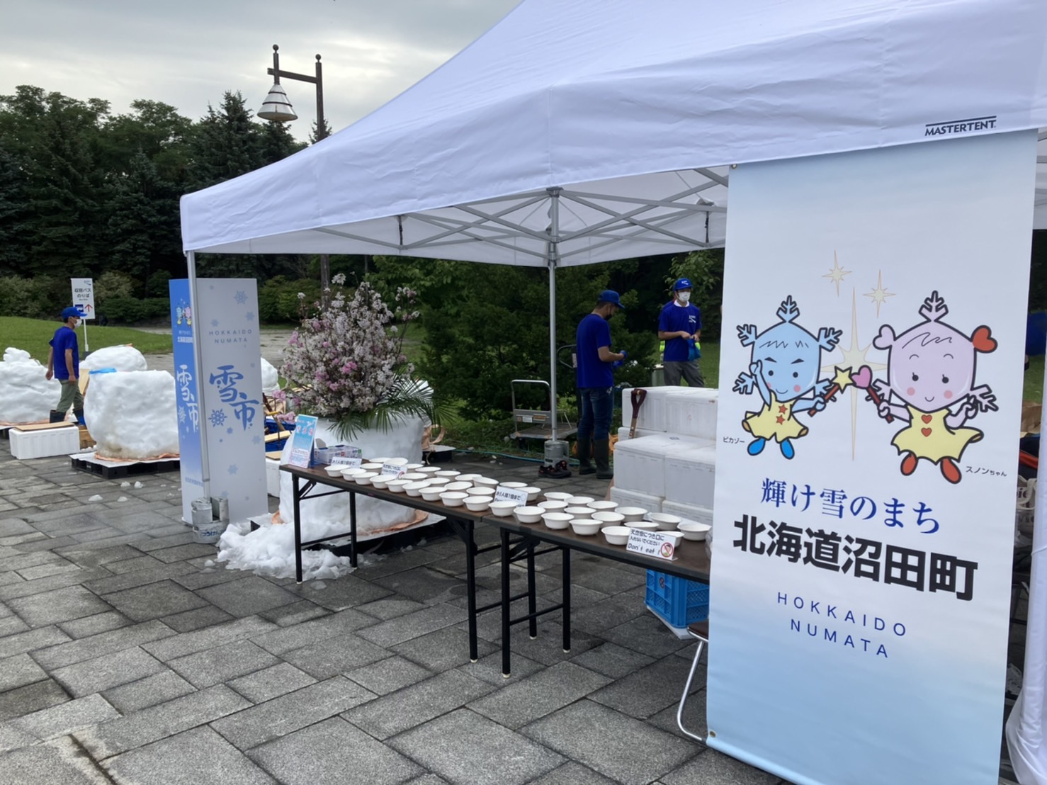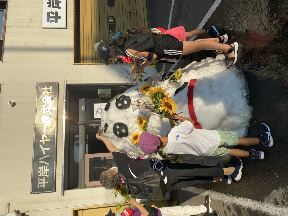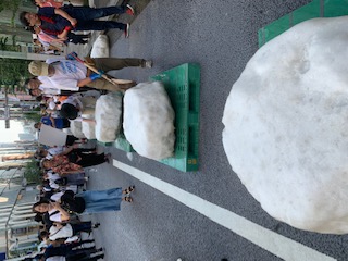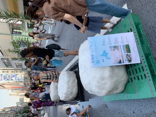 当日は北海道から繰り出したボランティアと東京の応援ボランティア総勢30人が人力で12柱を配置。炎天下の路上が打ち水効果でひんやりとした空間となり、外国人や子供たちが真夏の雪に触れて終日賑わいました。