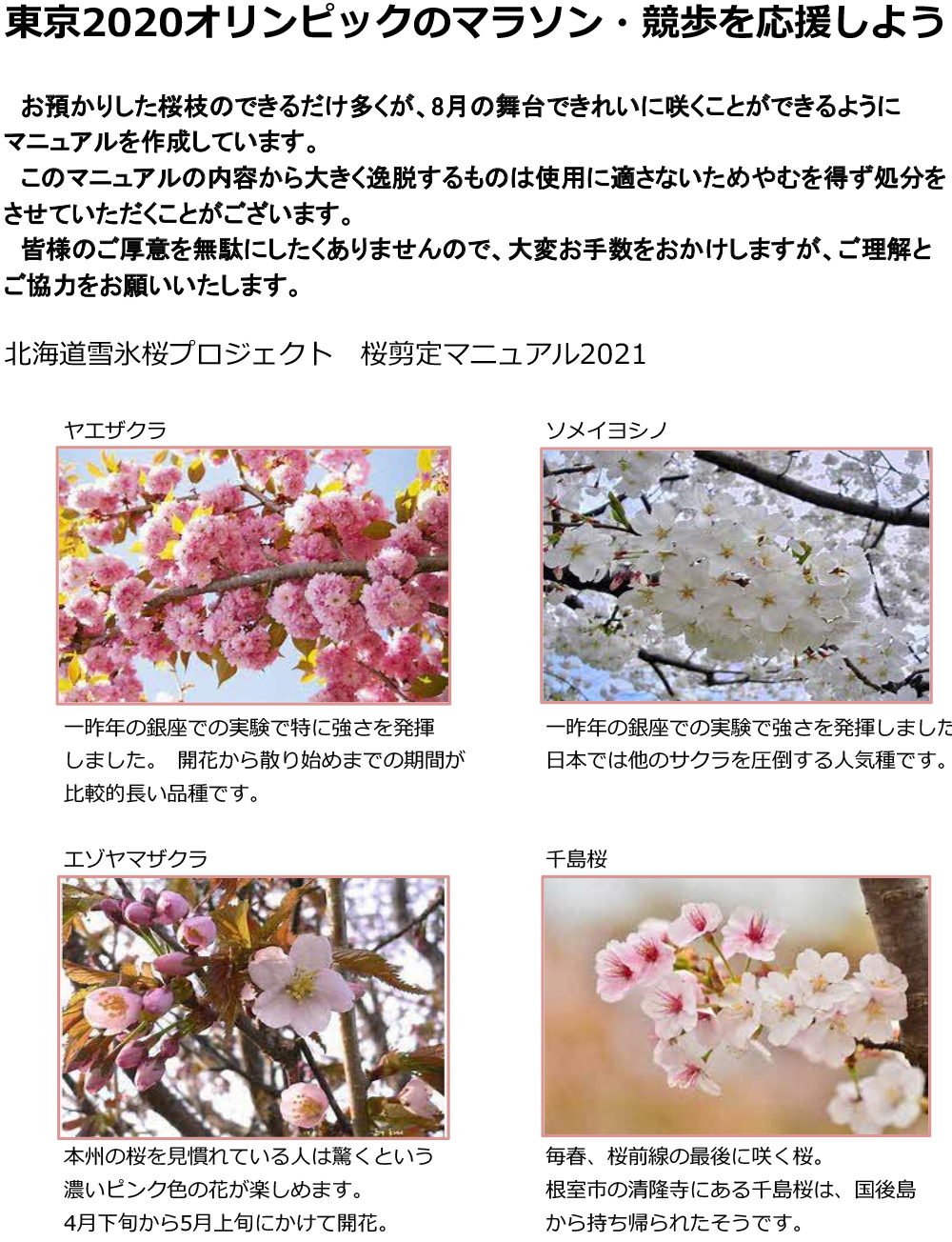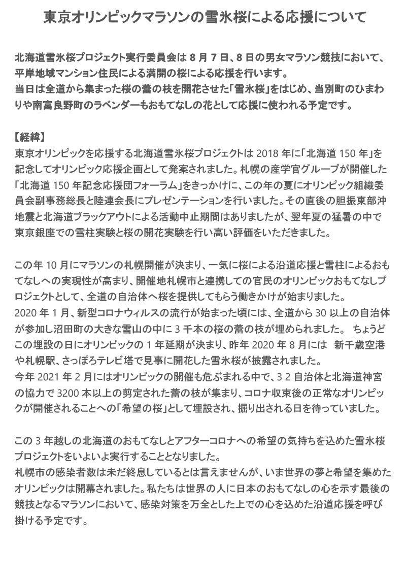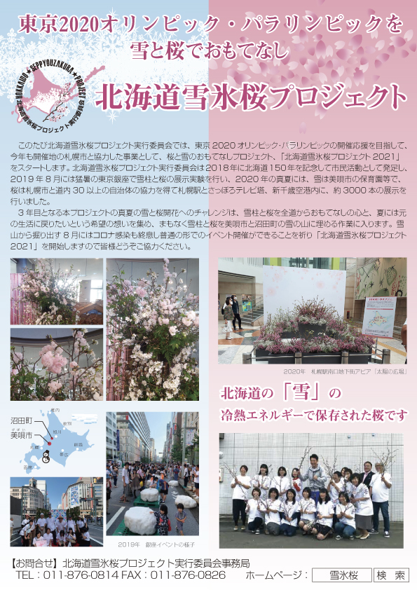 このたび北海道雪氷桜プロジェクト実行委員会では、東京2020オリンピック・パラリンピックの開催応援を目指して、今年も開催地の札幌市と協力した事業として、桜と雪のおもてなしプロジェクト、「北海道雪氷桜プロジェクト2021」をスタートします。