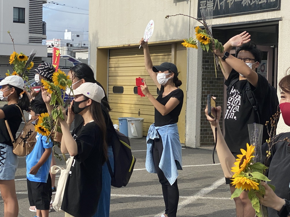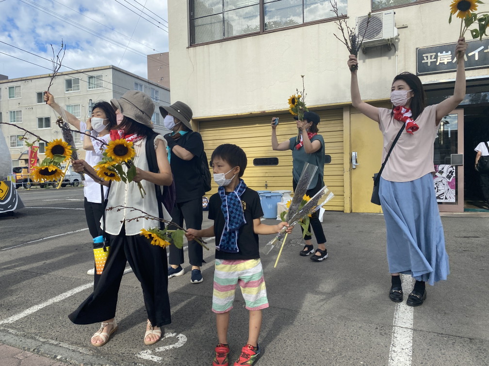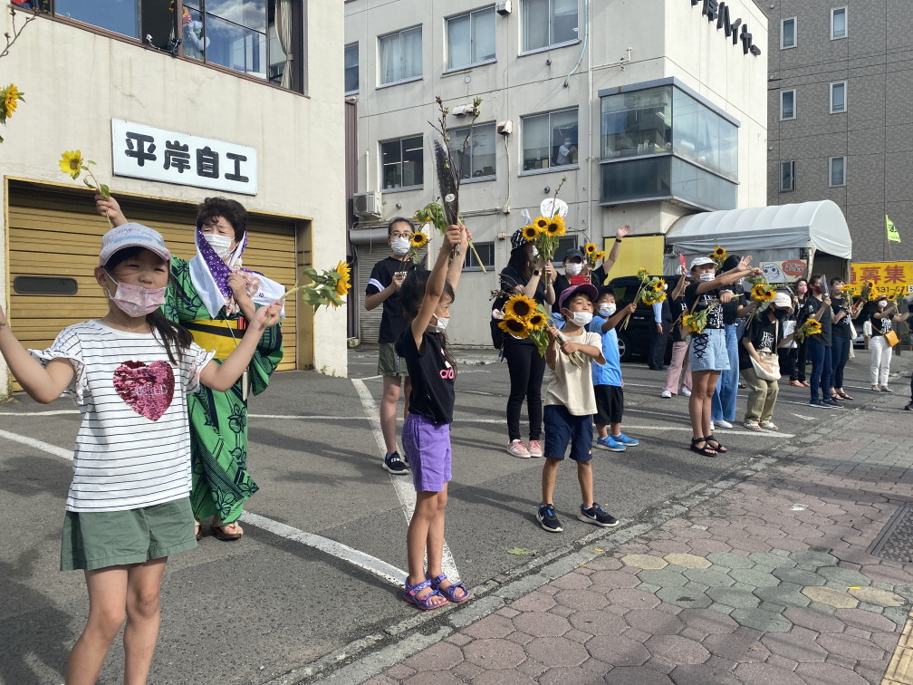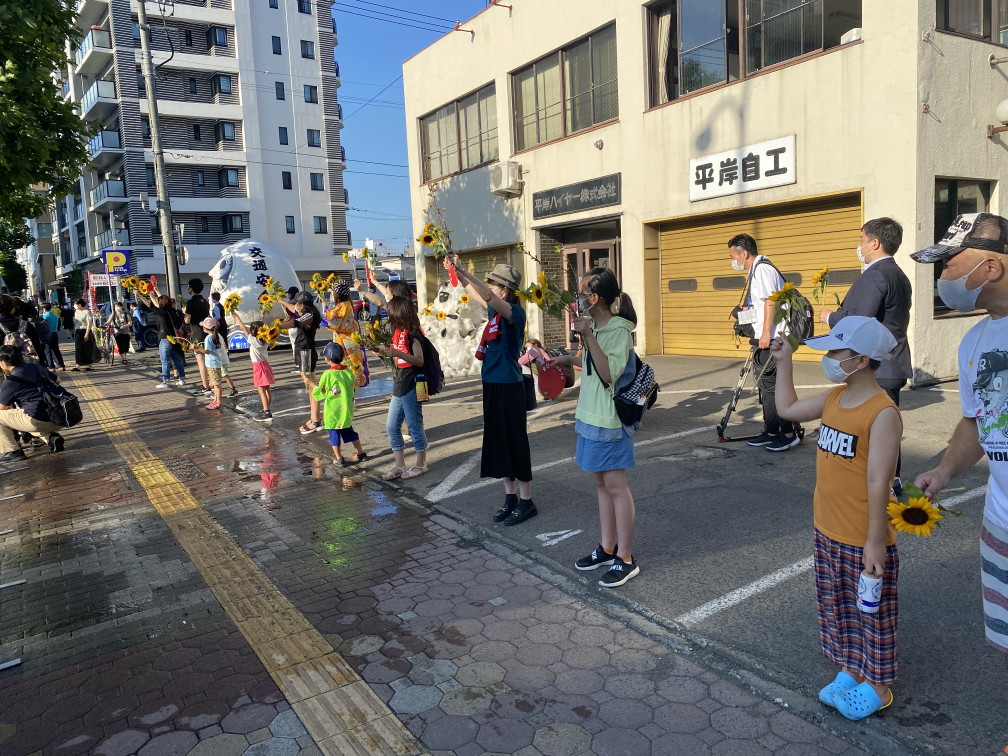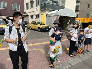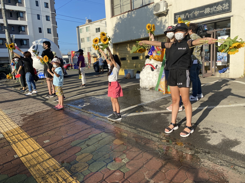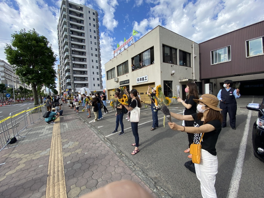 8月6日(金)に平岸天神有志など実行委員会ボランティアにより各戸に家族数分の桜の枝またはひまわり、ラベンダーを届けてもらいますので、窓やベランダからの応援に使って下さい。2日間開花をもたせるために受け取り後は水に浸けて冷暗所で保管してください。