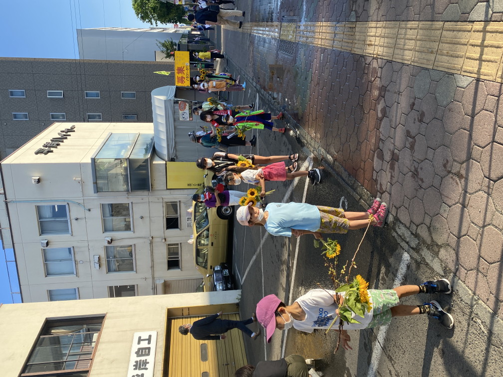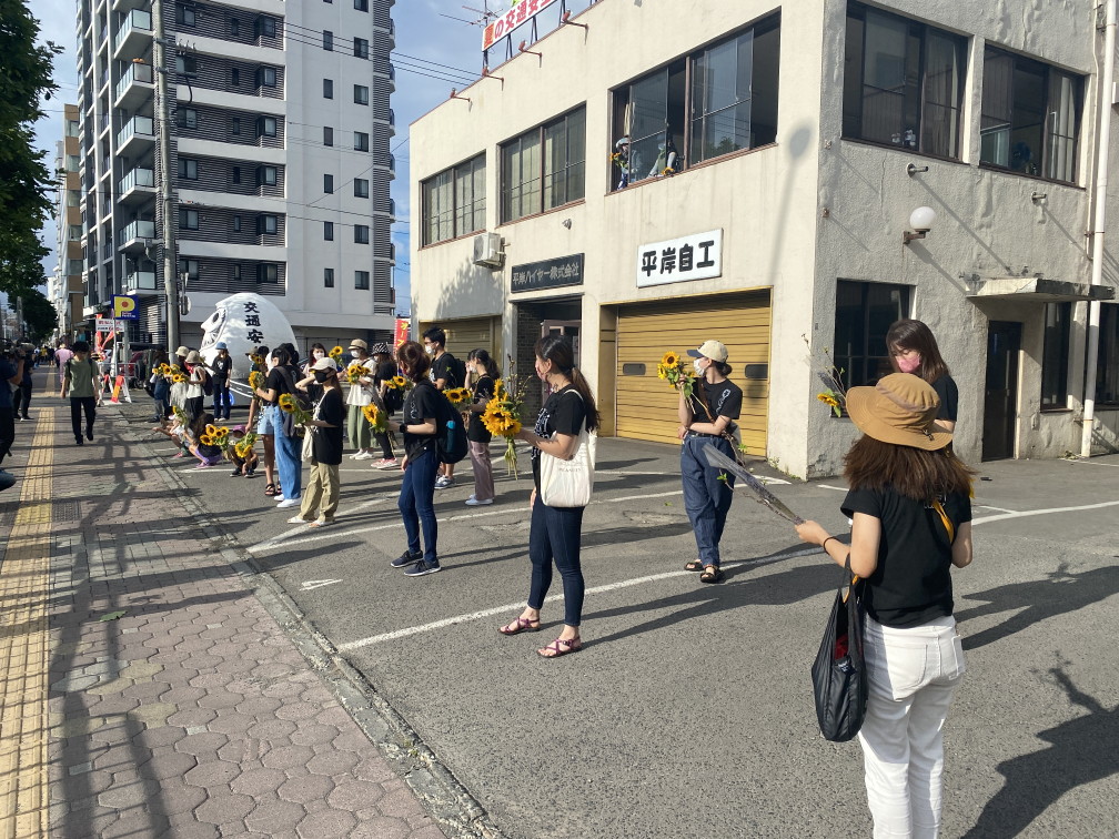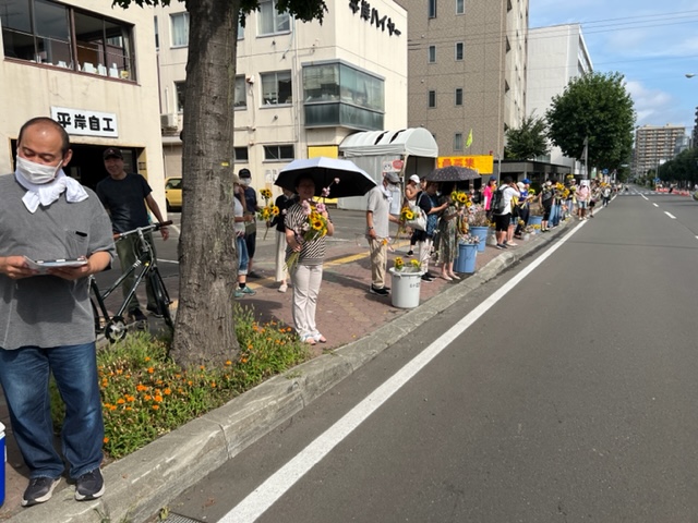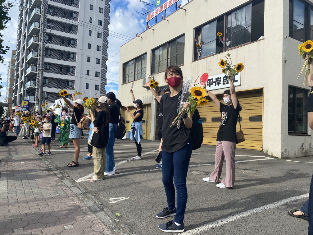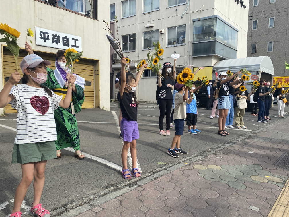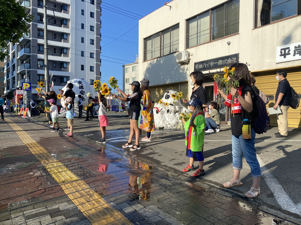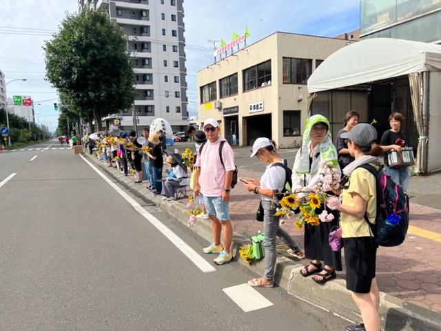 8月6日(金)に平岸天神有志など実行委員会ボランティアにより各戸に家族数分の桜の枝またはひまわり、ラベンダーを届けてもらいますので、窓やベランダからの応援に使って下さい。2日間開花をもたせるために受け取り後は水に浸けて冷暗所で保管してください。