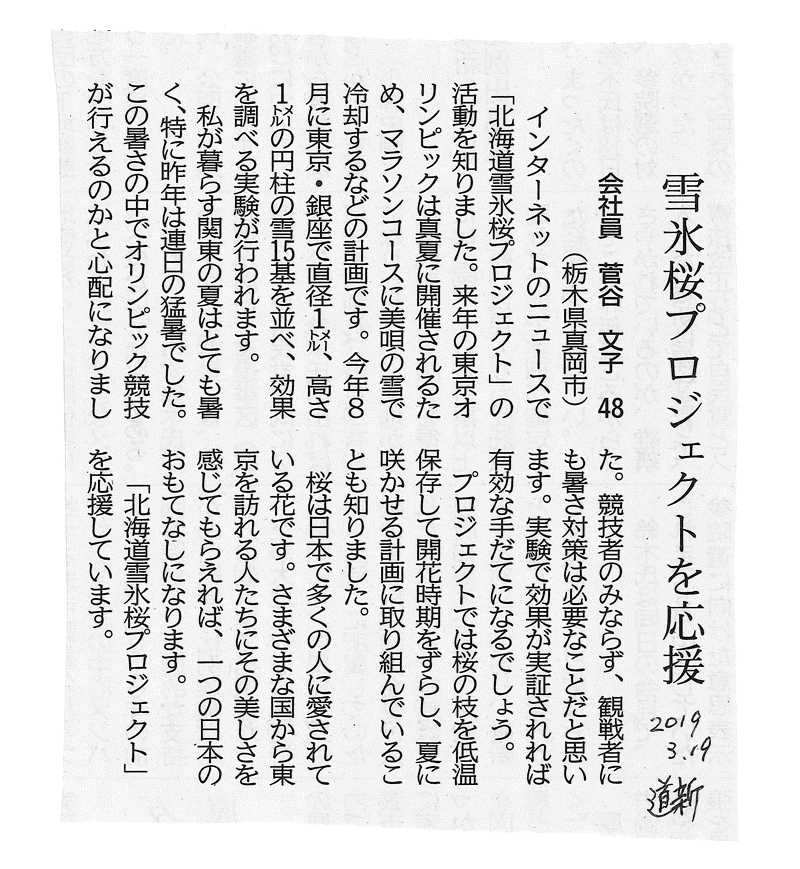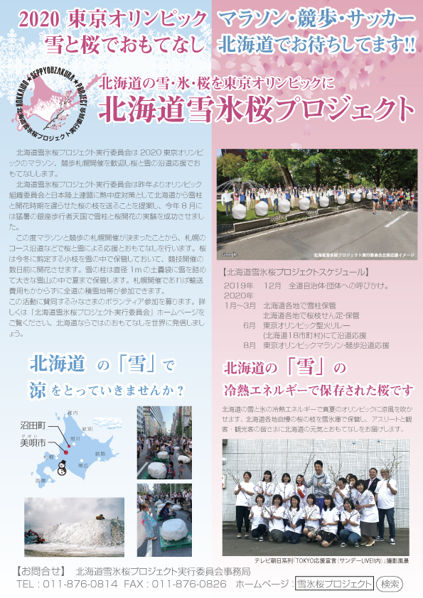 北海道雪氷桜プロジェクト実行委員会では2018年9月にオリンピック組織委員会と日本陸連に東京での熱中症対策として北海道の雪を活用する提案をし、2019年8月には猛暑の東京銀座に雪柱を搬送しての実験を行いましたが、この度組織委員会からコースでの活用は難しい旨の回答がありました。昨年11月のマラソン、競歩の札幌開催決定により熱中症対策としての採用は見送られましたが、アスリート、観光客、市民へのおもてなし市民活動として雪と桜の取り組みを進めていきます。