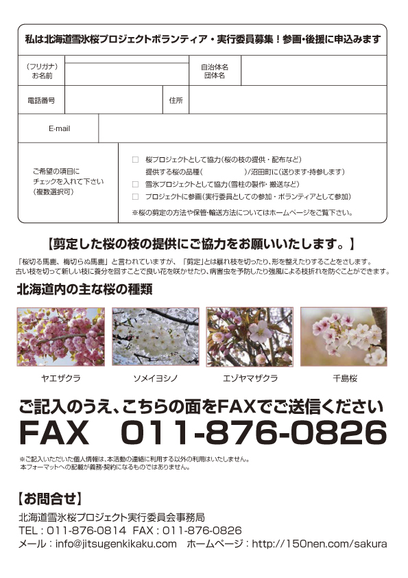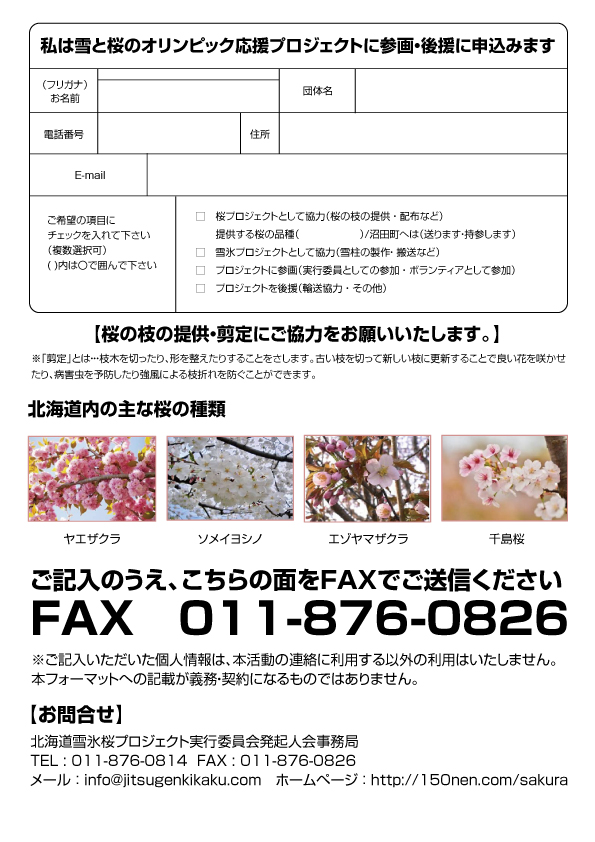 ※北海道雪氷桜プロジェクトへの参画・後援のお申込書の提出締め切りを2月29日(土)から3月14日(土)まで延期いたしました。ご協力いただける自治体の皆さまにはぜひご連絡いただきますようお願い申しあげます。
